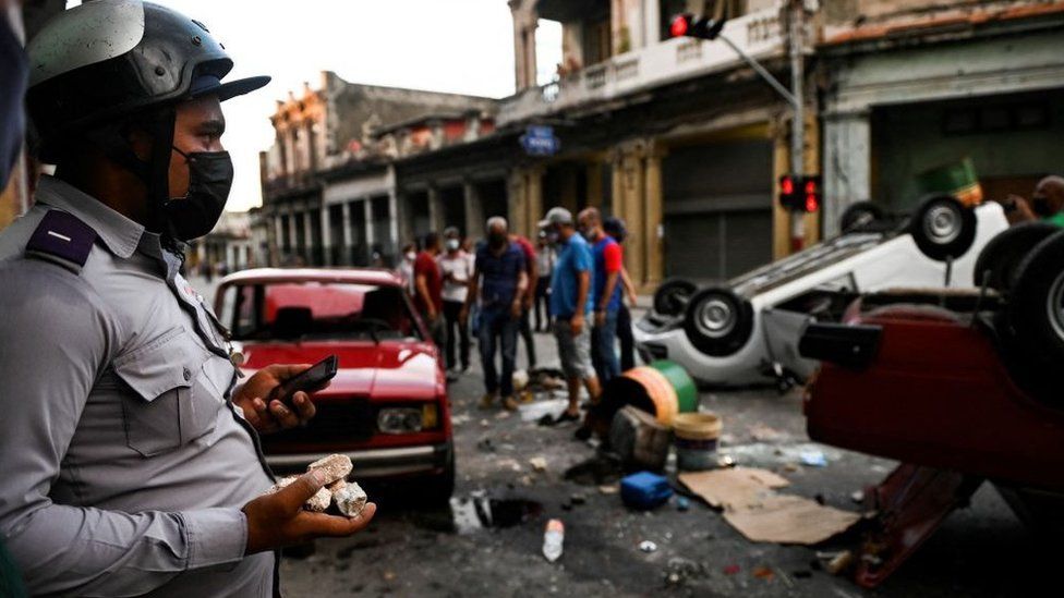 В сообщениях в социальных сетях было показано, как люди переворачивают полицейские машины и грабят некоторые государственные магазины, которые оценивают свои товары в иностранной валюте. Для многих кубинцев эти магазины - единственный способ купить предметы первой необходимости, но цены на них высоки.