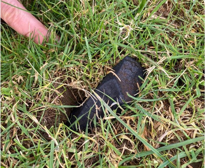 Для непосвященных экспонируемый метеорит выглядит как небольшой кусок полусгоревшего угля. Однако наклонитесь ближе, и вы увидите несколько прядей травы и даже немного грязи. Это то, что упало с неба в поле.